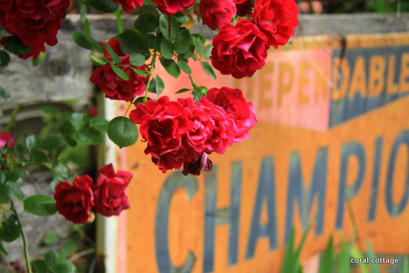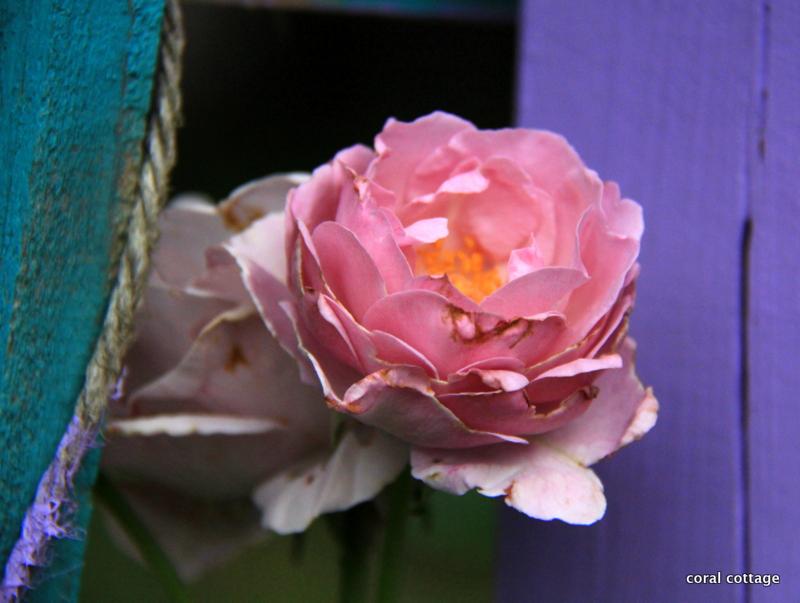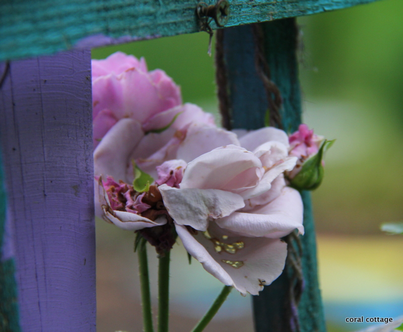 Sara – It is interesting that the photo of the roses that you said is your favorite because – when we were married, I had lavender colored roses in my bouquet. I planted them in our garden over the years but they did not survive. Two years ago I came across a single lavender rose at the hardware store. I planted it on the purple post that holds the sign pointing to the studio. The trellis is a bright turquoise/aqua I love the color combo – it really sets it all off. As this rose ages, it fades from lavender to pink. I am happy to say, so far it is doing quite well.