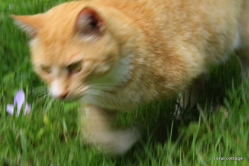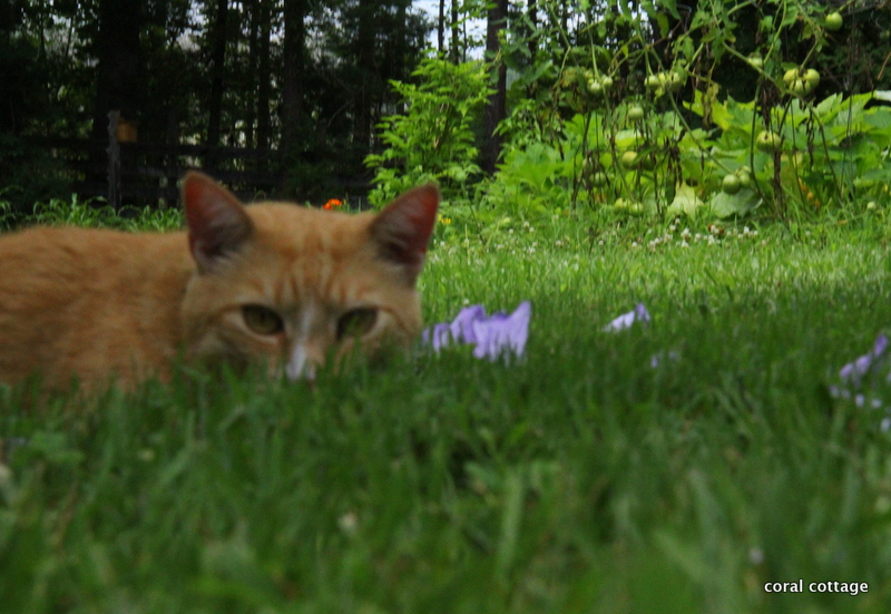 From a distance, I spy That Cat laying in the shade from the Rose of Sharon. Spent flowers all around him look like purple cigars.