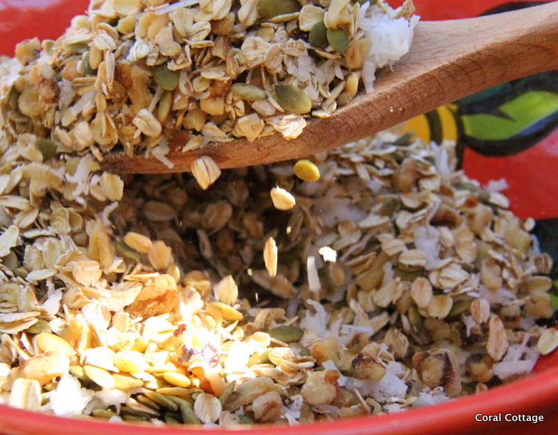 Making homemade granola, recipe from Staci over at Life at Cobble Hill Farm reading her farm blog and recipes are like taking a trip to the farm. It makes me happy. She has a nice recipe blog too.