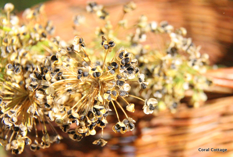 Collecting dried chives from the garden for the seeds