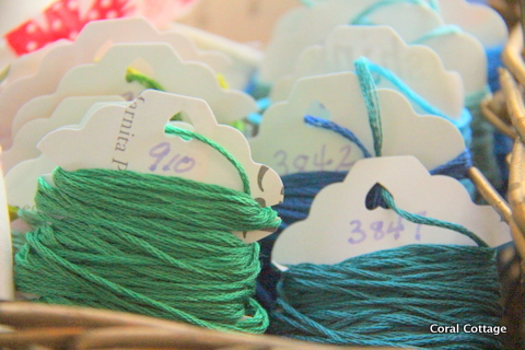 I used a craft punch to cut out the free artist pages from an old issue of  Somerset Studio magazine, wrote the color codes on the back and wrapped the thread as nicely as I could.