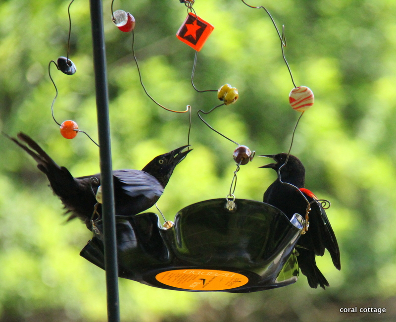 I put bird seed in my home-made record bird feeders. They hang by shepherds hooks in the back yard by the water.