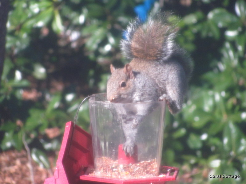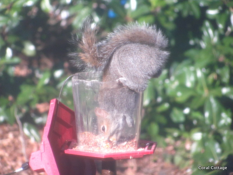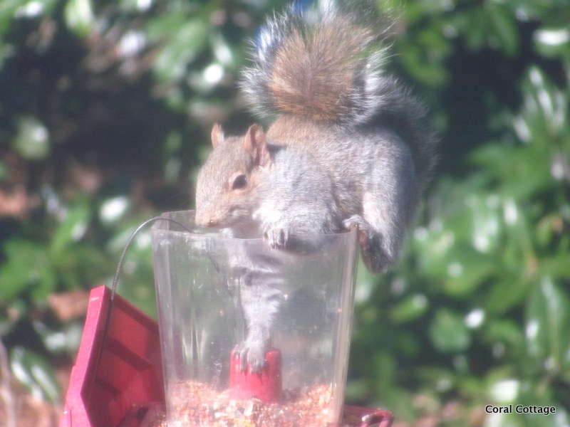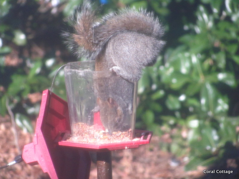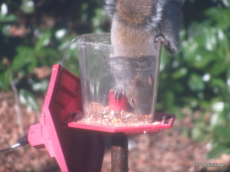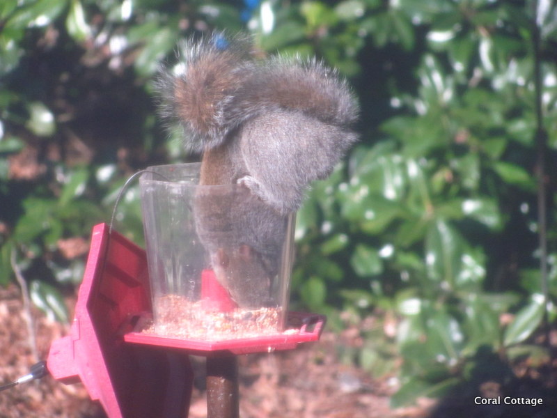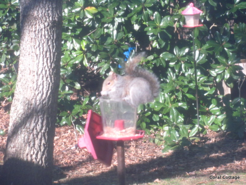 Don’t send me hate mail – I have two designated squirrel feeding stations, so that they get fed, and so they will leave the feeders alone.  Greedy little B——-.