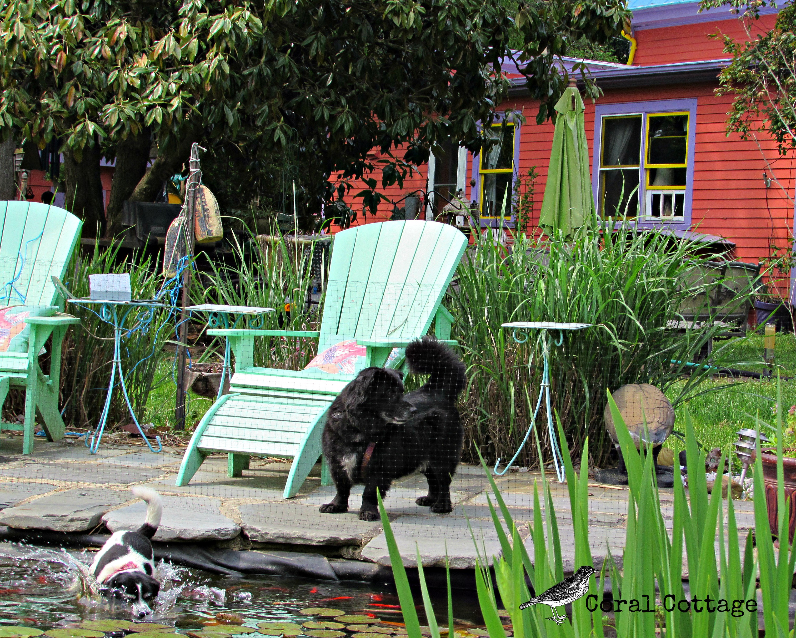 Mornings at the pond aren’t as peaceful as they used to be. Peanut becomes quite animated and runs back and forth like a lunatic barking and trying to catch the fish. Often, her enthusiasm gets the better of her and SPLASH! she ends up in the pond. Boo cheers her on with tail wagging and loud barking.