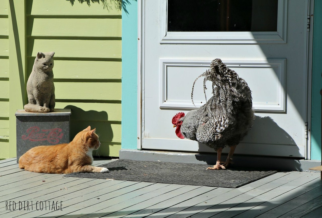 Love your splashes of RED : ) Your color palette is wonderful, reminds me of Key West…and adore the photos of the pets (especially the chickens…) I was so sad to read the last post, and hope the baby chix are doing well and Peanut will be okay… it is so NOT fun to grow old. And, of course, love your wild flowers and hope the seasons get themselves sorted and back into proper order very soon : )