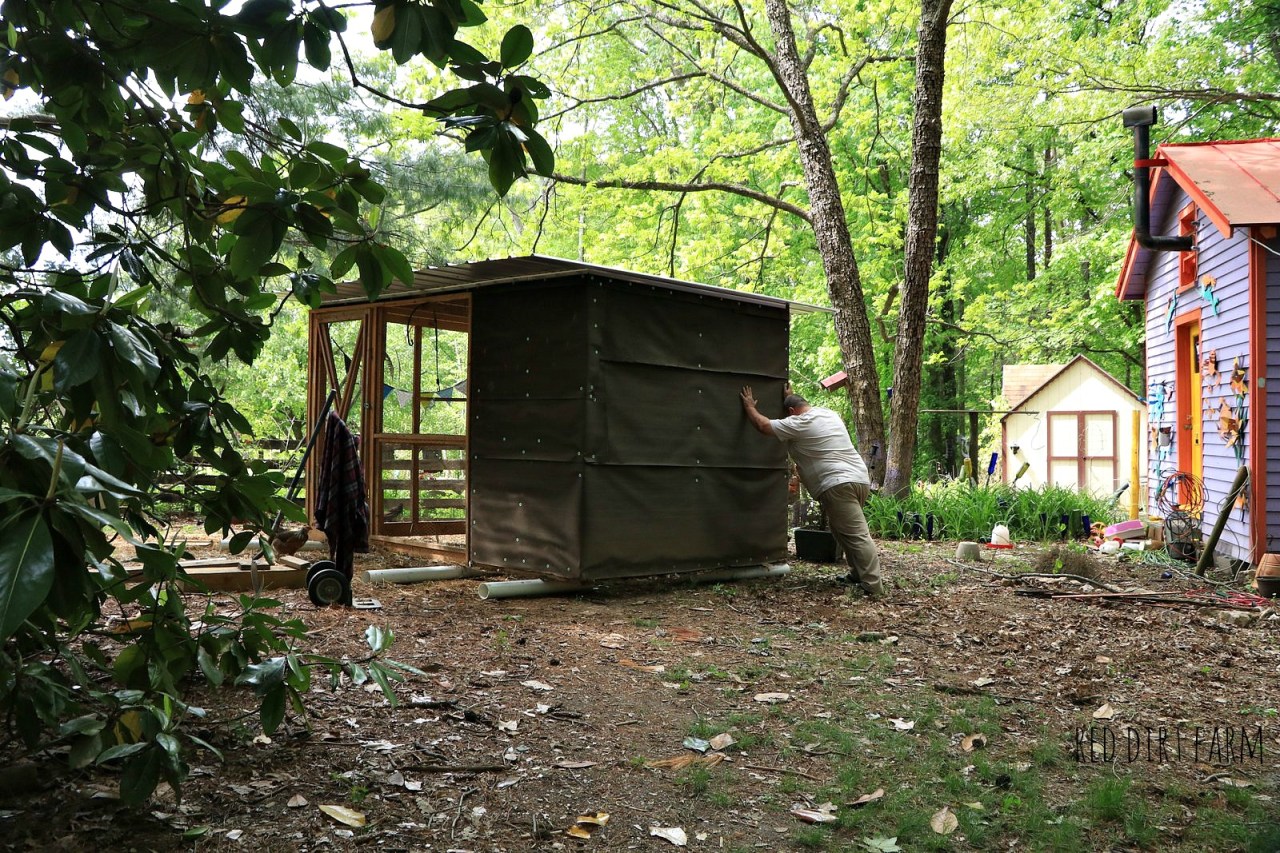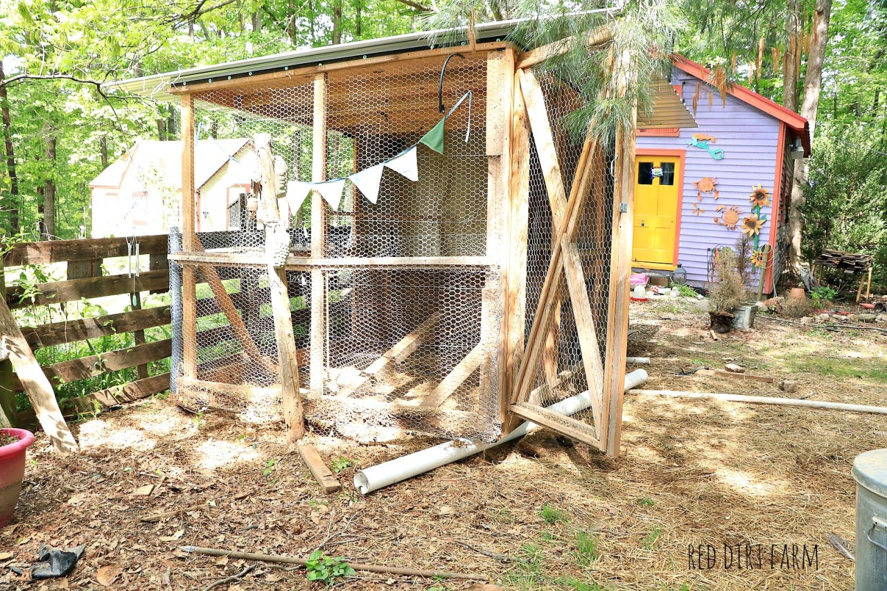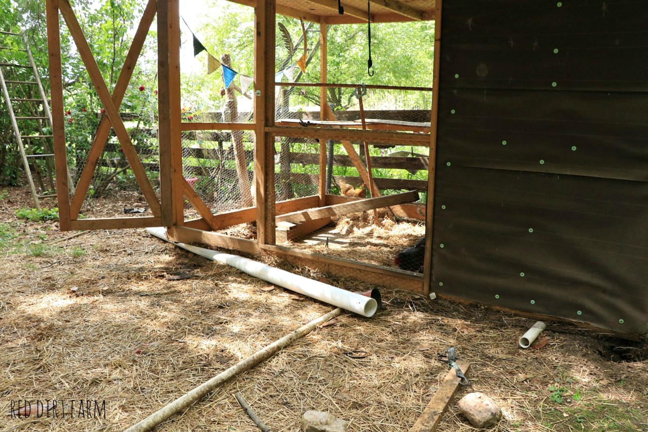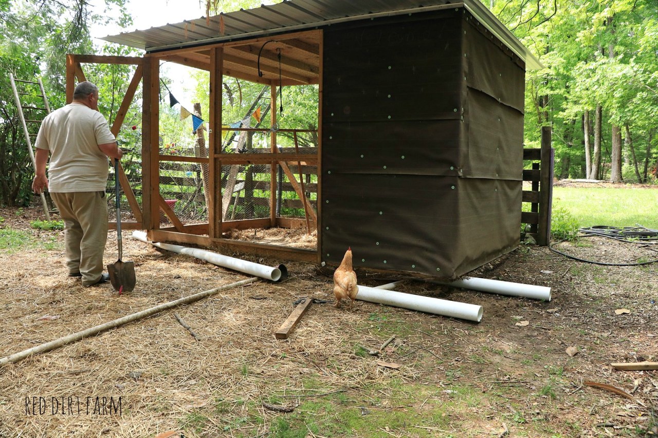 Mr. Cottage first dug a little away from the bottom of the coop, then he took a 4×4 and a large block of wood to use as leverage.