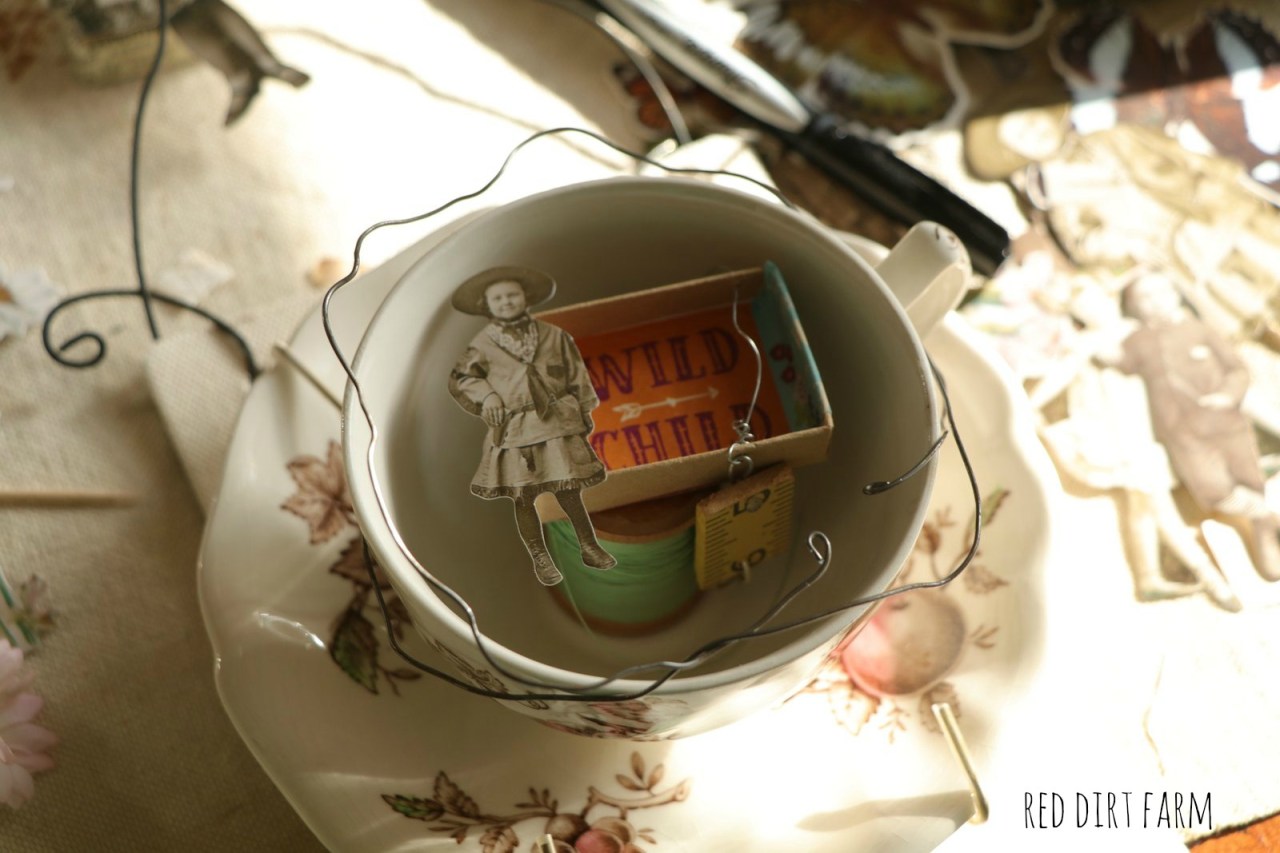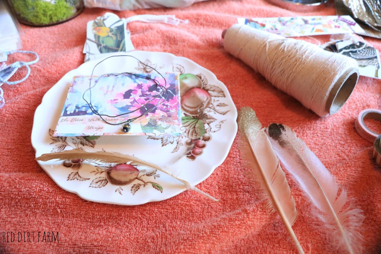 My mixed media assemblage endeavors from the week have all gone to a local shop for purchase. They are a combination of my watercolor images, feathers from my girls, vintage ephemera, and vintage Johnson Bros. china, die cuts from the Tim Holtz collection and bits and pieces of this and that.