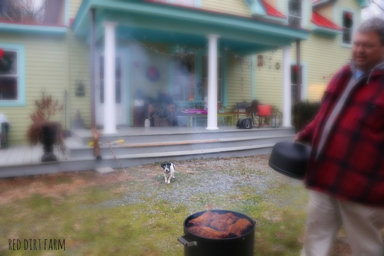 It was decided that we would put the new smoker that was recently given to us, to good use. Pork ribs were our choice. I made a dry rub that they rested in for 24 hours. I also made my bourbon, maple barbecue sauce – oh bliss. I went out and gathered up wood from an apple tree that we took down earlier this summer. Mr. Cottage cut it into smaller pieces so it would fit in the smoker and away we went. It was a day-long process. We watched old holiday movies and snuggled in the easy chairs a good part of the day, while the ribs smoked away.