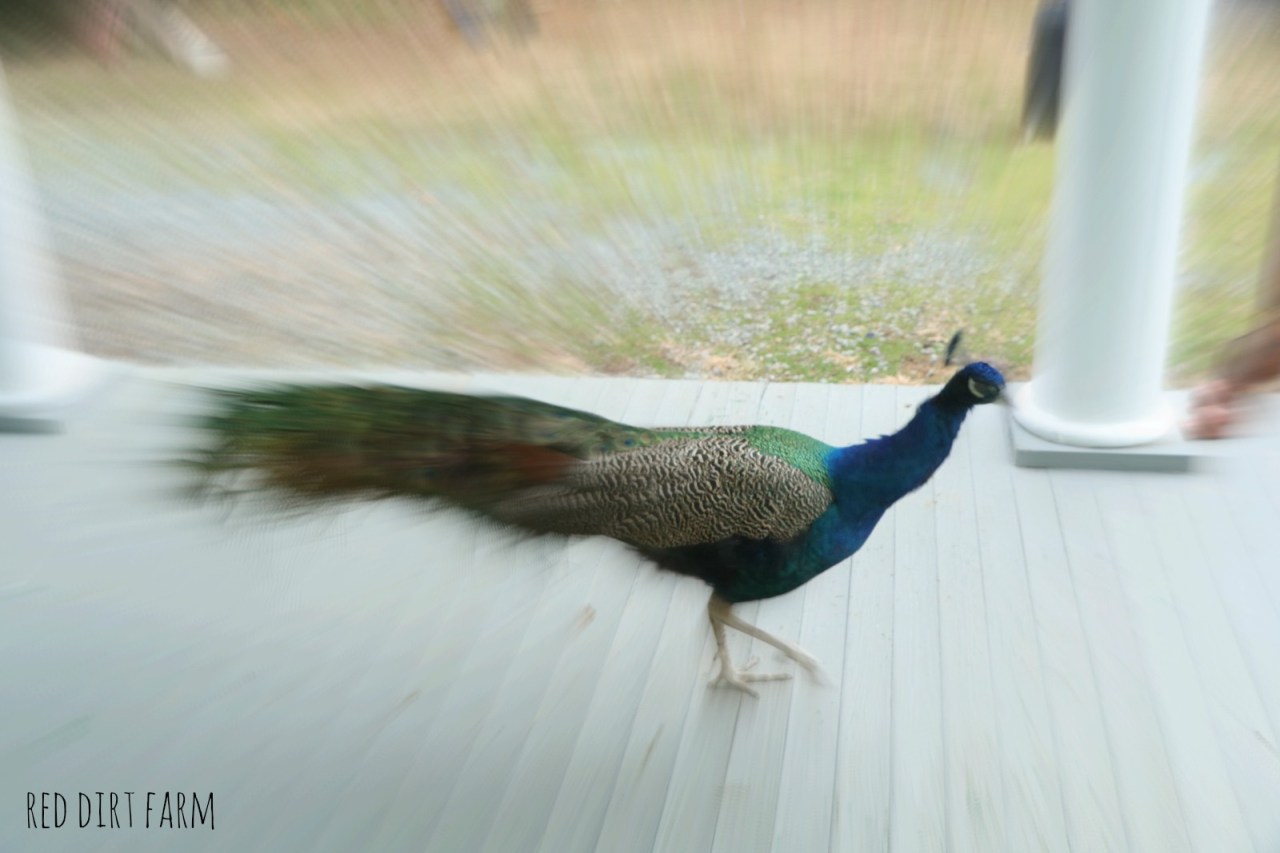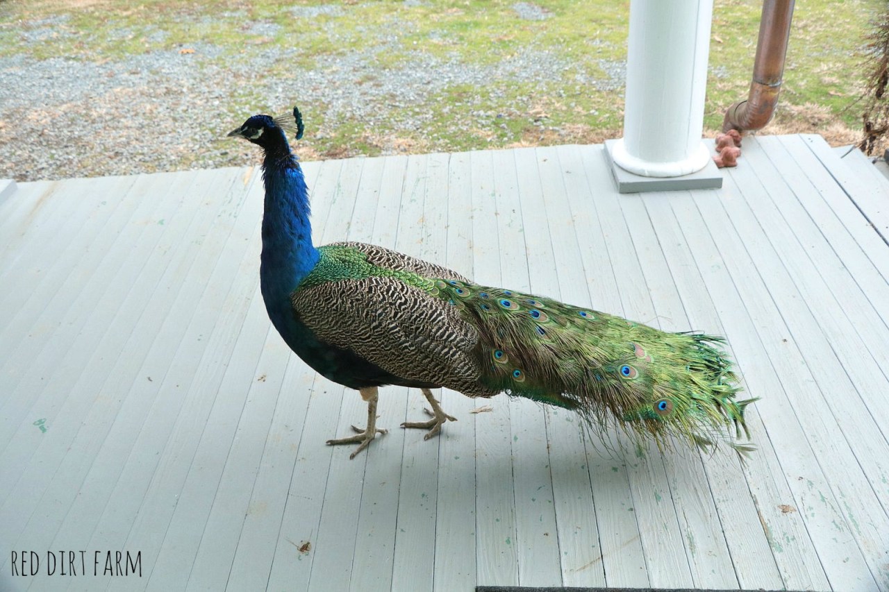 Papaya hung out on the front porch most of the day looking in the window and the front door, pacing back and forth, demanding we give him some extra treats. I think he muttered something about his gift to us was how lucky we are to see his magnificent plumage – oh no he isn’t vain at all – he’s just a peacock.
