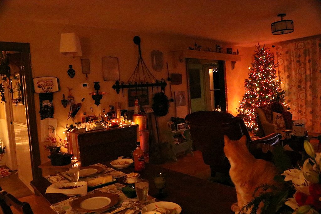 We didn’t roar, we quietly ushered in the new decade, Mr. Red Dirt and I. We worked together to create a lovely, not so little dinner for the two of us which consisted of steak, lobster, shrimp, baked potato and salad. The fancy dishware from a friend which is used once a year was brought out and decorated our humble farm table. I guess I should be ashamed to admit I didn’t even polish the silver. We ate by candle and twinkle light and That Cat sat on the table and Boo dog at my feet, supervising it all. So busy was I eating all the fabulous food, not a photo was taken.