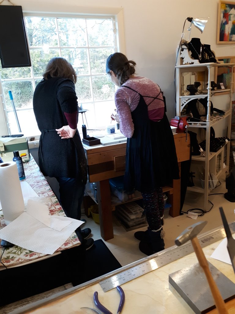 I took my second silver soldering class last weekend. It was the same class, both times. Sometimes it takes two lessons to figure it out. There on the table to the left of the pink Primrose, a round hammered copper pendant I made. I’m thinking of incorporating it into another piece of work…