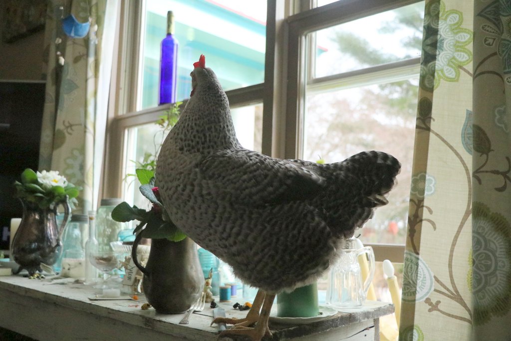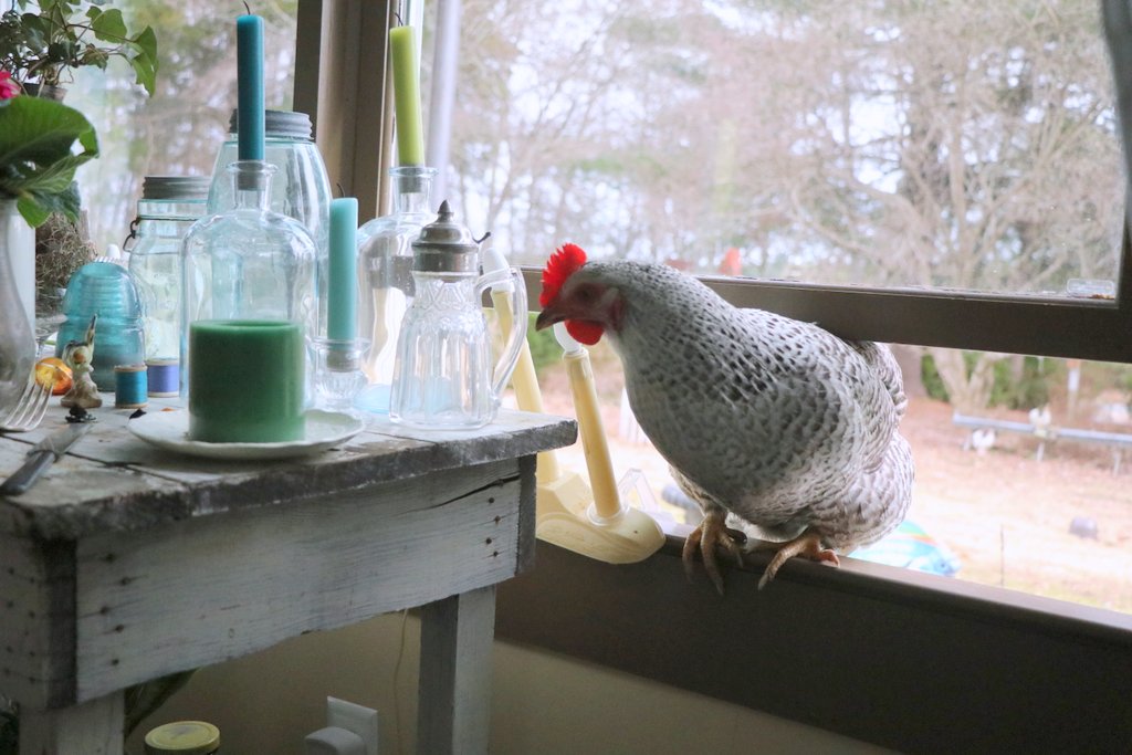 I opened the windows wide to let those warm breezes in and to freshen up the house from stale stuffy winter. Little Miss Bee, quickly found her way through the open window and made herself at home in the dog bed, on the furniture, the kitchen table and all sorts of places one should not have a chicken.