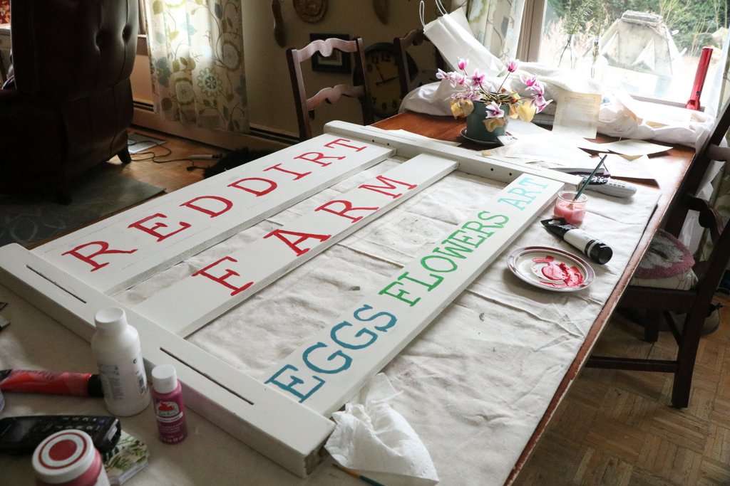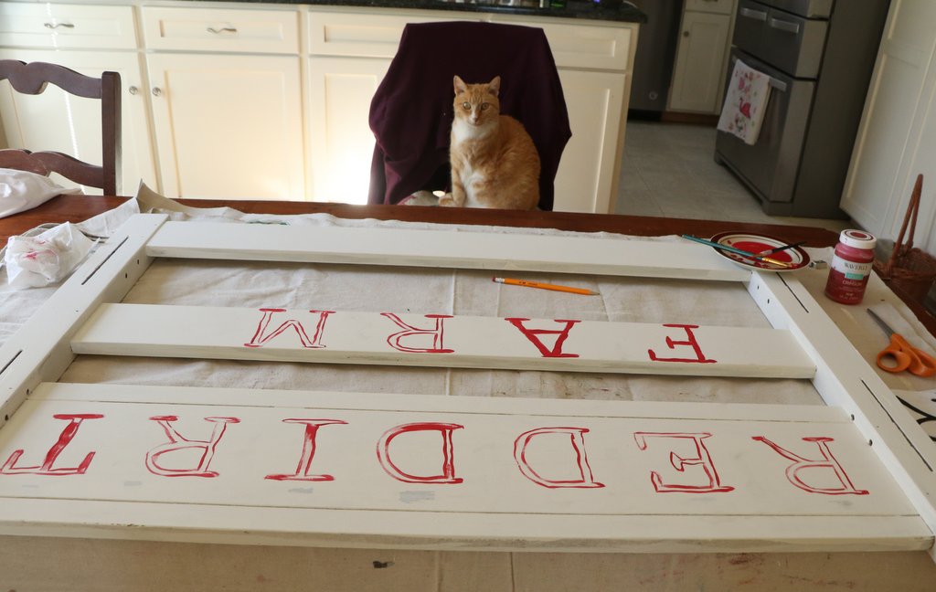 My friend and I went on an outing at the local thrift store, where I purchased a wood head and footboard for just a few dollars. I said I was going to paint a farm sign on it. My friend agreed it sounded like a good project. That was two years ago. These past two years the bed has been stored away in the barn among my million and one other someday projects. A professionally painted sign simply isn’t in the budget, and quite frankly even if it was I’m not sure I would want a new sign. I much prefer recycling old stuff. This week after applying a base coat of paint, I started hand lettering the headboard. I’m really slow and don’t have the steadiest of hands. Occasionally a chicken or a cat jumps up in the middle of my work and I have to stop and feed them or cuddle them. No, I did not measure my spacing – I’m an eyeballing it type girl. It is coming along though, and no worries to professional sign painters out there – your job is safe, I’m no threat!