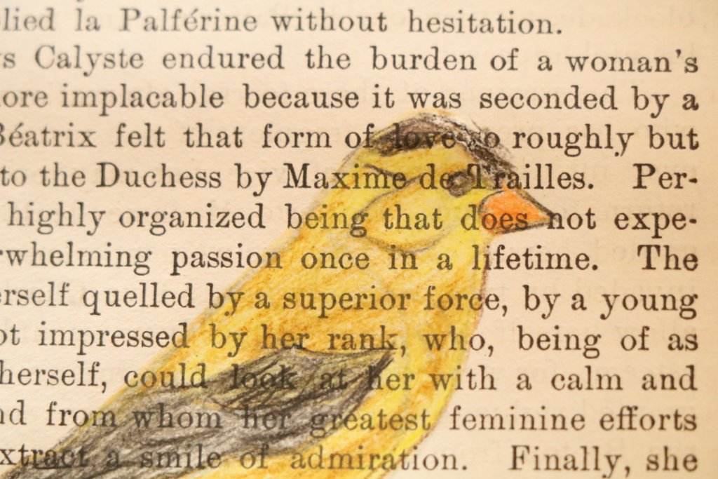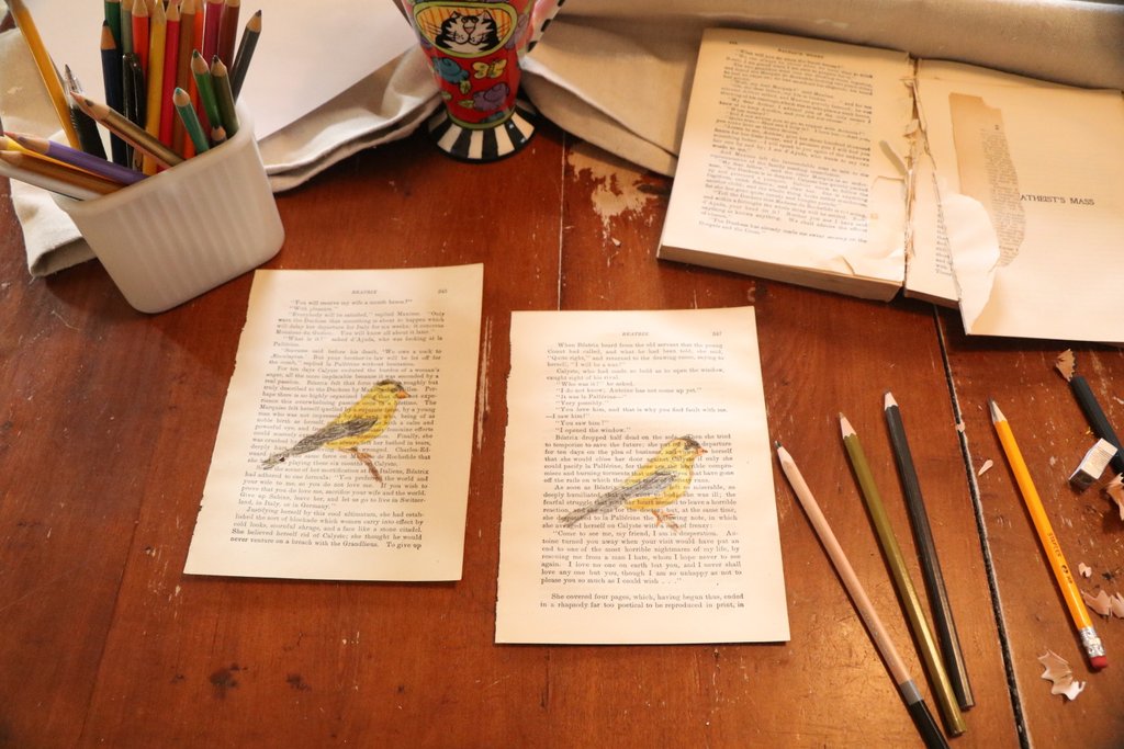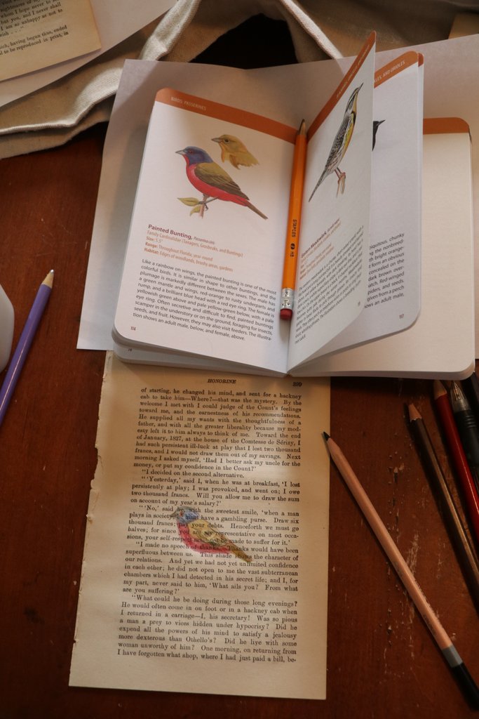 I have been doing some bird sketches with colored pencil on vintage book paper. I love working with old paper, but it is quite fragile. I managed to rip through the paper in a few spots while filling in the details. I have applied light layers of Gesso, for my next attempt, to see if that presents a bit more stable area before I sketch. I just did some light coats, hoping to maintain the look of the original print.