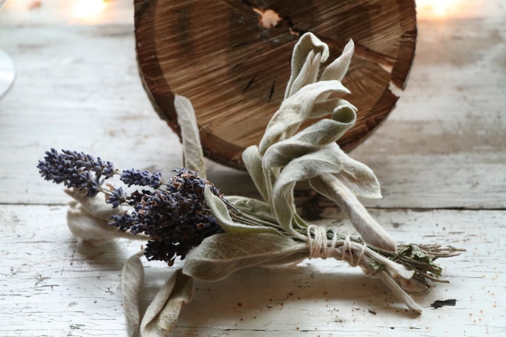 Dried lambs ears and lavender, my herbal version of a smudge stick. I experimented last summer with making these. I used a lot of the lamb’s ear in place of white sage, which is traditionally used in smudge sticks, we do not, however, grow that here. Lavender and rosemary and roses are some of my other favorite flowers and herbs to use.