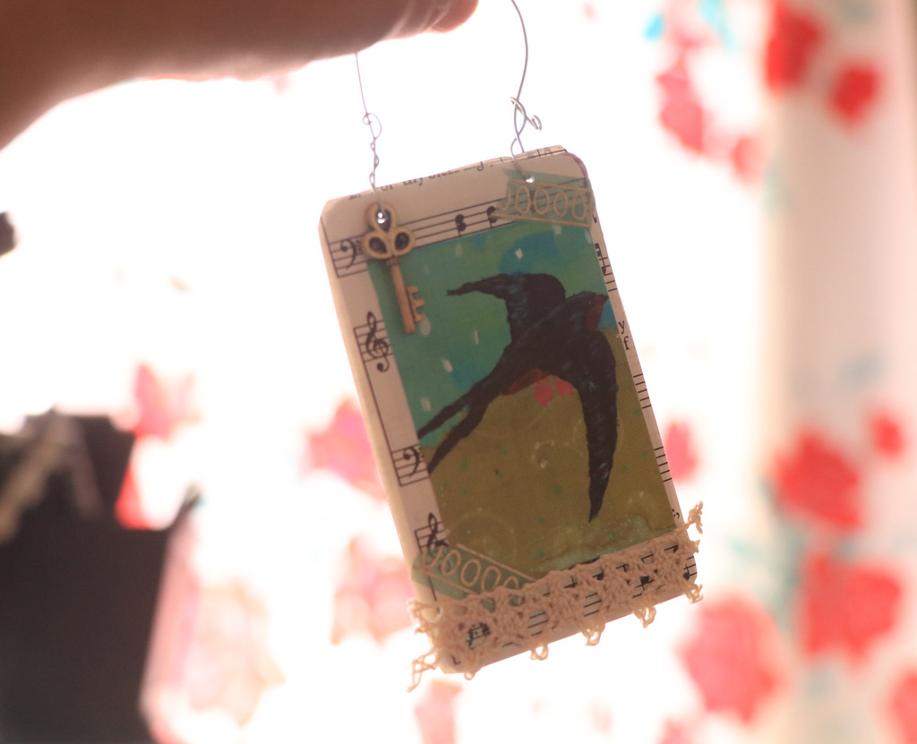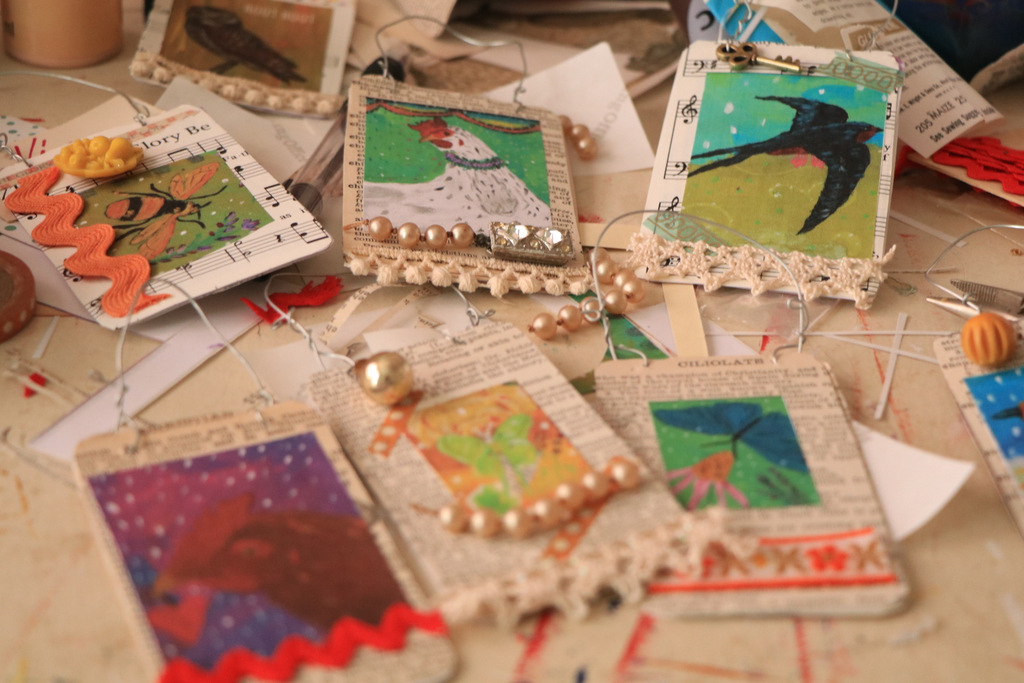 I fell earlier this week and sprained my ankle, so I took advantage of being off my feet by puttered around in my crafting space. I created some little ornaments/whatchamacallits from prints of my paintings layered atop some old vintage book pages, and sheet music, scraps of this and that.