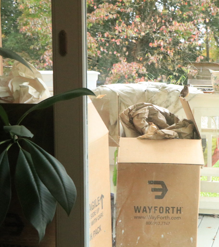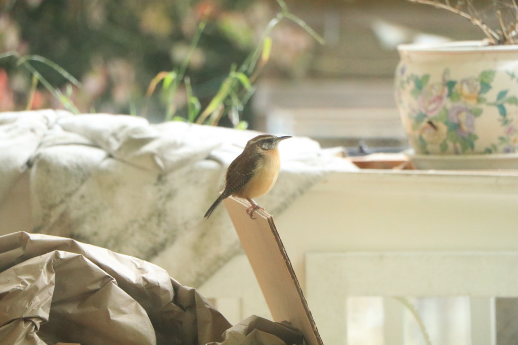 While I have been typing away this morning, a sweet little wren landed on one of the moving boxes on the porch and has been serenading me for the past half hour. I took a few photos through the dirty glass door, she was happy to oblige.