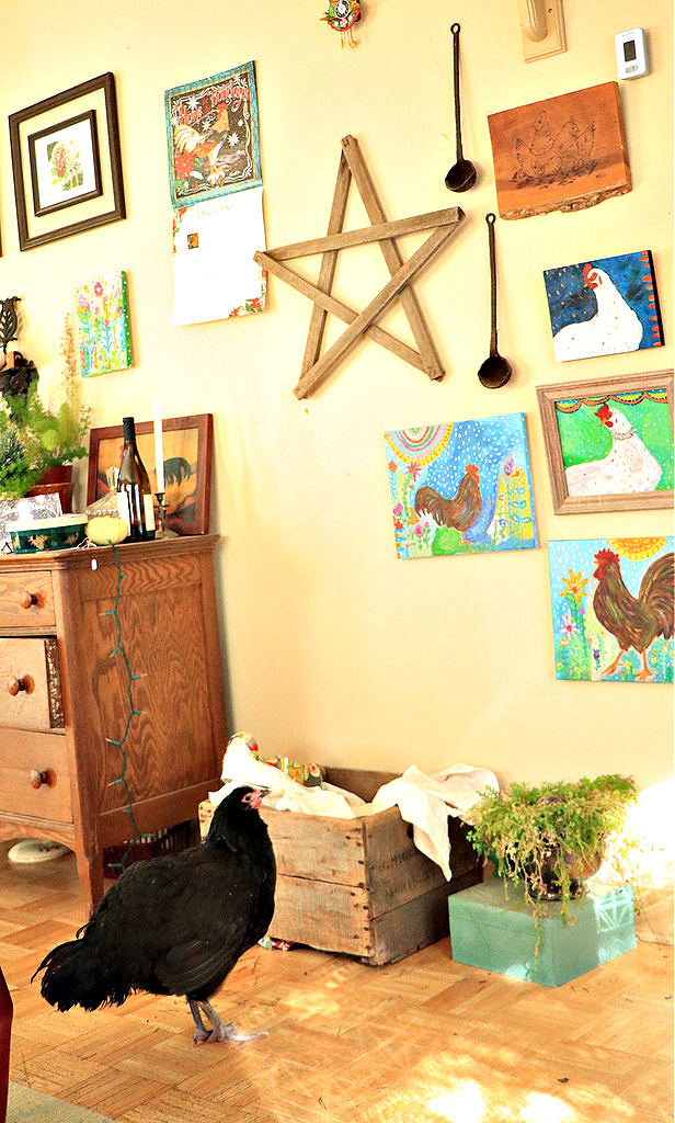 It is a hard time, for sure. I hope humans and fowl will improve and flourish. I have to tell you the photo of the black chicken looking up at your chicken artwork made me smile!