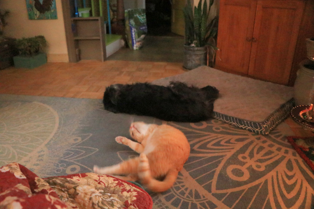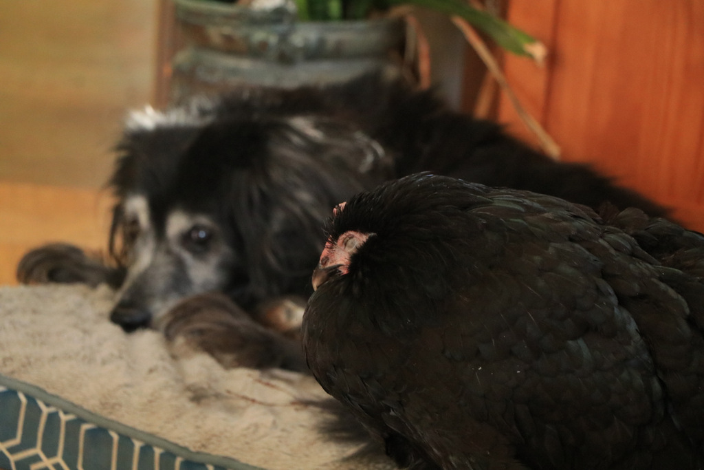 Amber Ale, I brought in the house to try and nurse her. It seemed rather hopeless as I did all I could and there wasn’t an improvement. For two long days, she didn’t eat and had horrible violent seizures. I resorted to using a syringe to get water with electrolytes into her, which is rather tricky with a chicken as they can easily drown this way. Finally Christmas Day she started improving. Wet cat food watered down was the first thing I got her to eat. Then I shredded carrots and broccoli and chopped blueberries and strawberries. She also gets oatmeal with a bit of bacon grease. Considering how sick she was and still is, it feels like a miracle that she is doing as well as she is. She is preening today, that is a very good sign. Amber is also feeling well enough to walk around and explore the house a bit. She spent the first couple of days in the bathroom where it was quiet and peaceful for her to rest. So good to have her out and about. She has decided that sleeping on the dog bed with Boo is her favorite place to be.