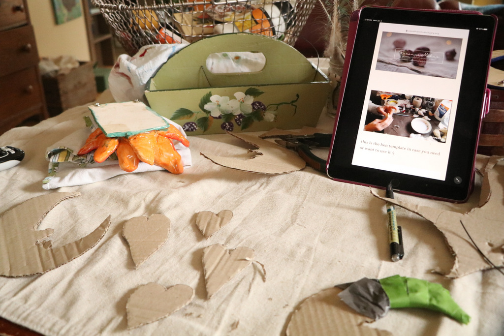 Other projects on the work table are paper mache moons and heats.  I started out wanting to make some spun cotton ornaments and quickly realized I wasn’t skilled and patient enough at this time to continue pursuing.  Perhaps at another time.  I got derailed after the events that unfolded this week, so I spent the next day shredding vintage book pages and sheet music along with copies of my paintings.  Rather rewarding doing all that ripping of pages.
