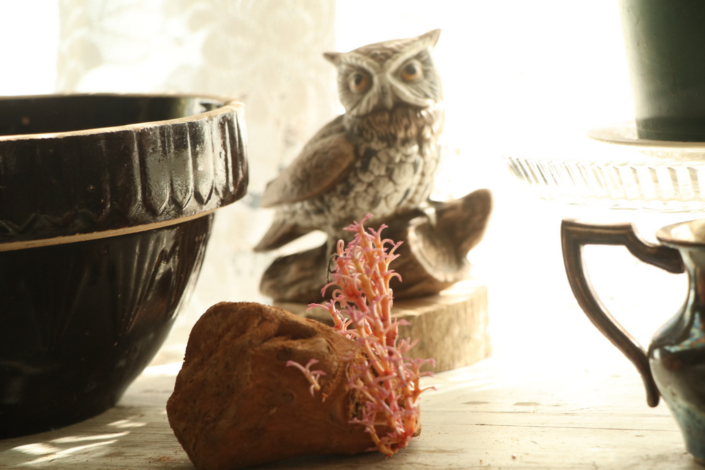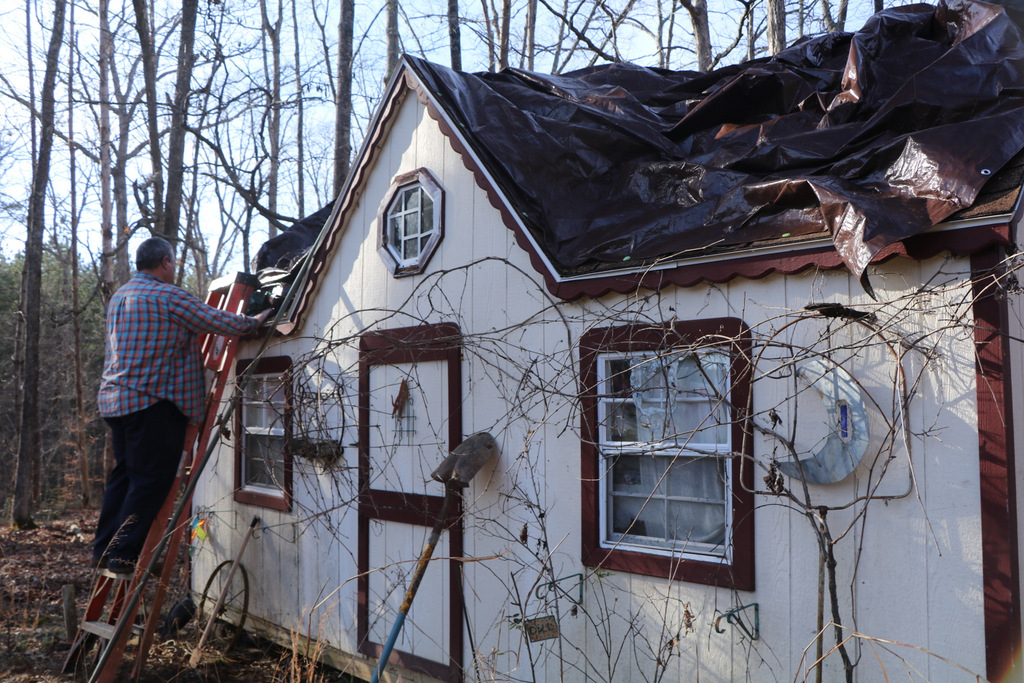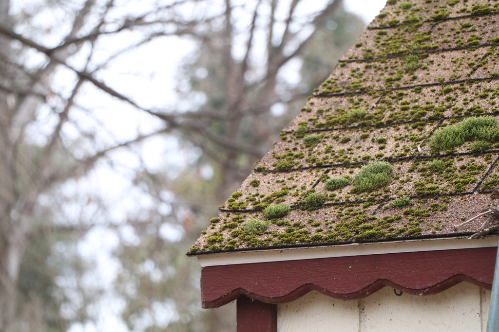 I discovered that the roof on little halfmoon cottage is leaking and must be replaced. I store my mother’s collection of fabric in this building. Mr. Red Dirt has covered it with a tarp until we can make repairs. The many years’ accumulation of moss on the shingles has caused a bit of decay. I romanticized how lovely and mystical that moss looked on the roof. Then the reality came to me, in an unpleasant awakening. In the back of my mind, I have a plan for this building.