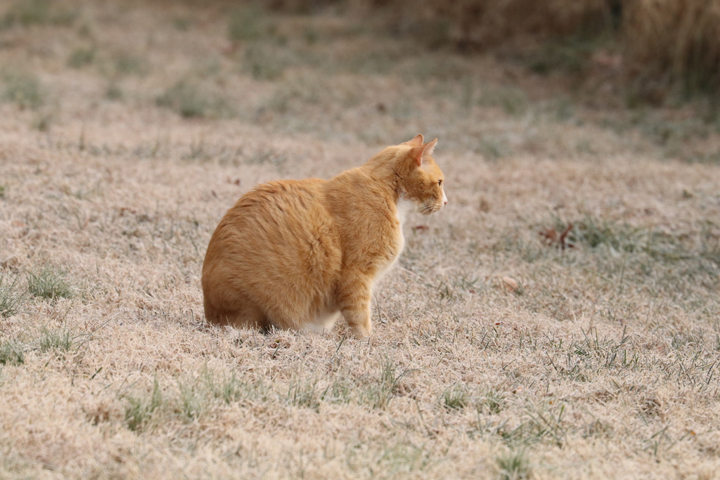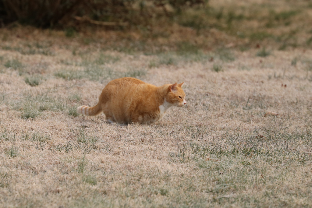 It is a cold frosty morning, the grass crunches under my feet. Blue Jay’s are screaming loudly and insistently. Don’t they always? That Cat is stalking something with deep concentration. Eyes laser-focused on his subject.