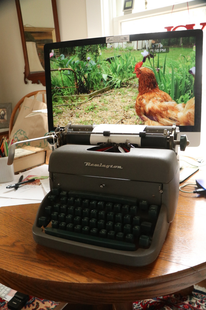 I loved this post, and can relate to the typewriter…and the hawk!!! Forty years ago I was bookshop- giftshop manager at a nature center in New Jersey and the same model typewriter was at my elbow…..electric, how exciting was that!! And the hawk…a current day event here in Florida. It concerns me to see him perched on the peak of our neighbors roof surveying our bird feeder area outside our kitchen bay window. We live on a lake frequented by an assortment of ducks who parade daily from the water to assess the seed under the feeder which attracts bunnies, baby ducks (in season, which is the big worry), and squirrels of course…and our hummer feeder hangs there above it all. It brings us so much pleasure and so far no fatalities with the hawk. Nature brings peace and we all need that now. Best wishes, Ginny