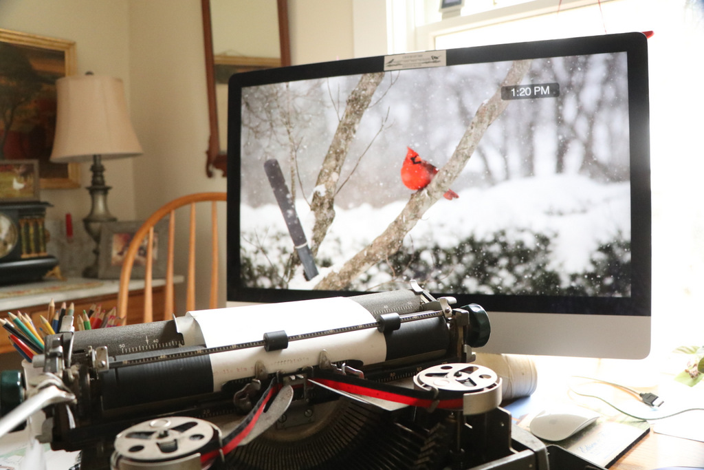 I have worked from home the last decade and use a laptop at the kitchen table. From sitting so many hours a day for work then catching up on social media, blogging, etc. I developed a problem with my shoulder. It was painful and I took the laptop and put it on a one-foot high metal basket and bought a wireless keyboard. It helped immensely to sit a different way, but I will tell you that the keyboard seems like I barely pick my fingers off the keys – it is such a light touch. If you’re not already using a desktop with a keyboard, you might want to try a wireless keyboard – it will be easy on the carpal tunnel. The photo of the vintage typewriter with the big screen behind it made me take a second look. That Cat will appreciate less noise and more nap time.