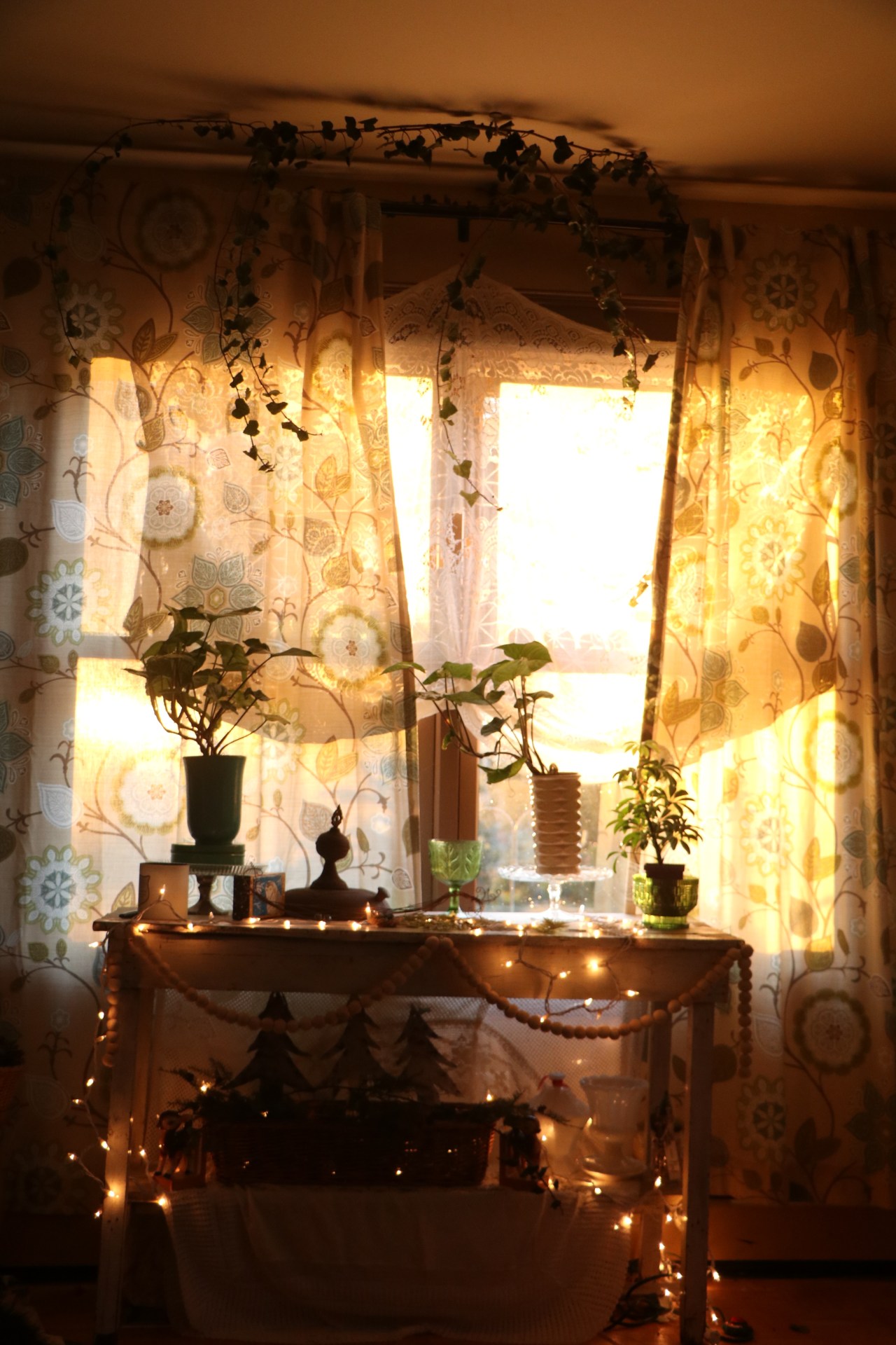 Seeing sunlight stream through my lacy curtain – which is really an old tablecloth brings me so much joy. It’s one of the pleasures of watching the sunrise. Soon after the sun comes up the birds start coming to the feeder in droves, and that too is a simple pleasure. Mr. Red Dirt placed our after Christmas tree on the porch next to one of the feeders so that I can sit and watch the feathered friends take cover inside, as the snow was falling I threw handfuls of birdseed among the branches.