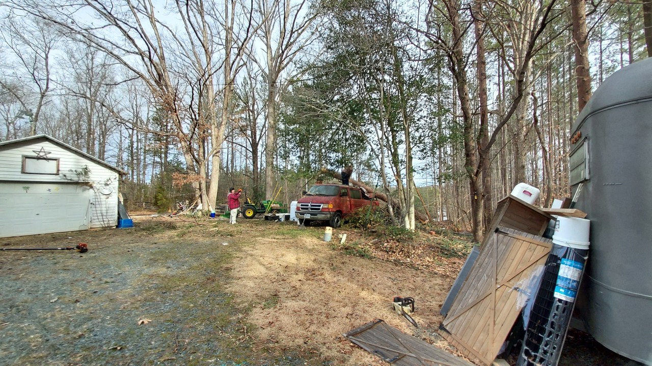 Yesterday Mr. Red Dirt with the help of a neighbor worked on getting trees off the garage and van, worried that accumulated snows that are coming will damage the roof further. So very grateful for the help of our neighbors, yesterday and during the last storm. So many trees fell from our property blocking the road for days. The fire department, neighbors, the Virginia Department of Forestry and highway department worked to clear the road.
