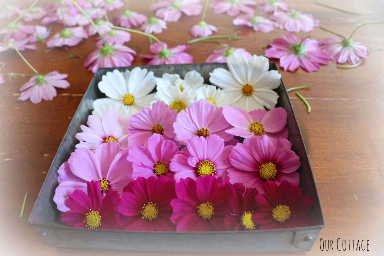 Back in October, I decided to preserve some of the last flowers of the season from our gardens, by means of pressing. I went out to the gardens and cut the best-looking cosmos.