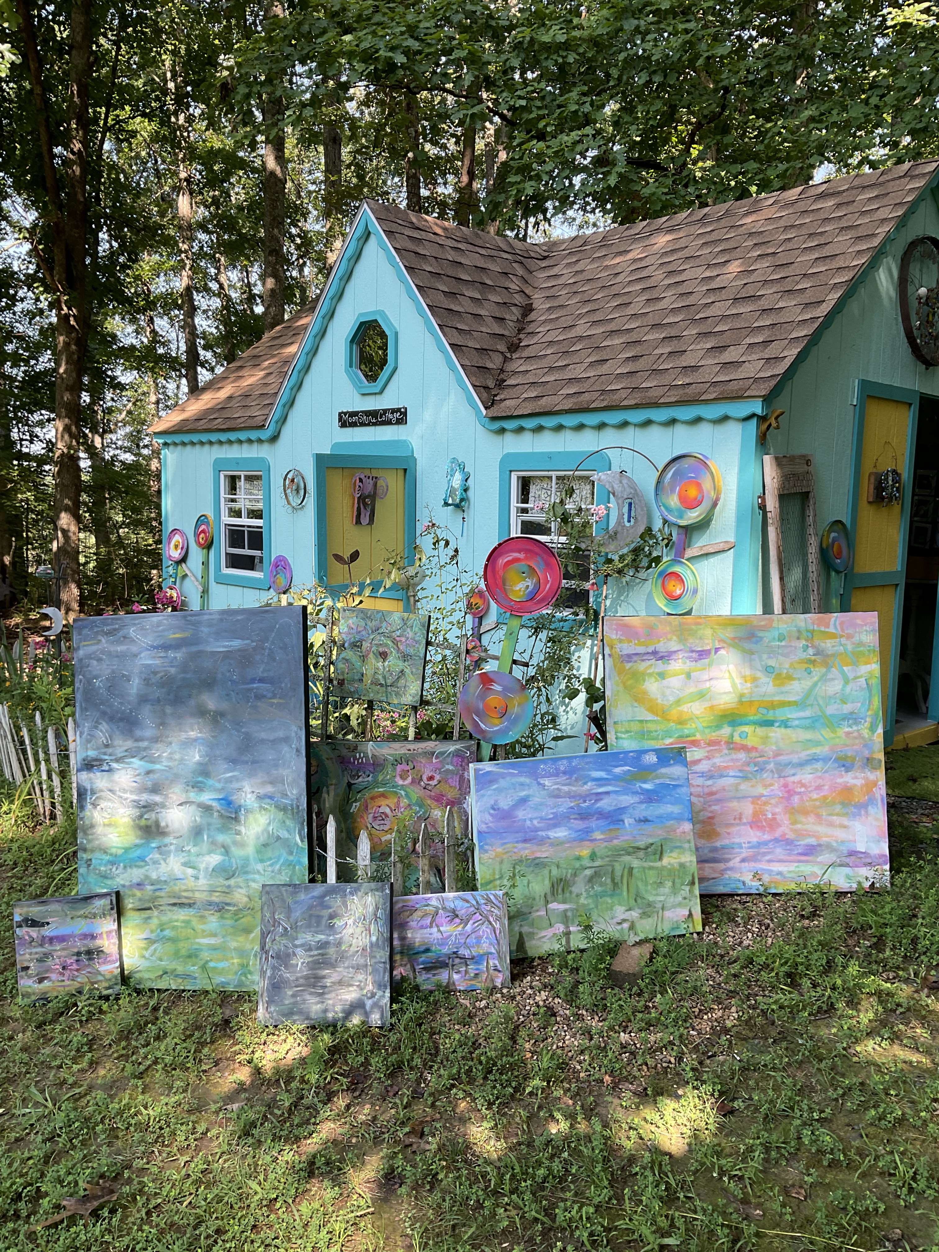 group of paintings outside moonshine cottage
